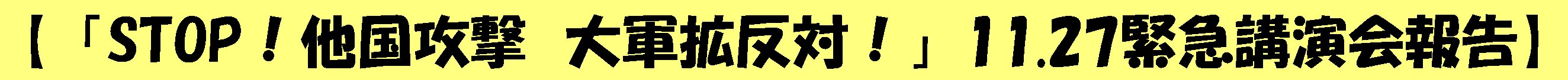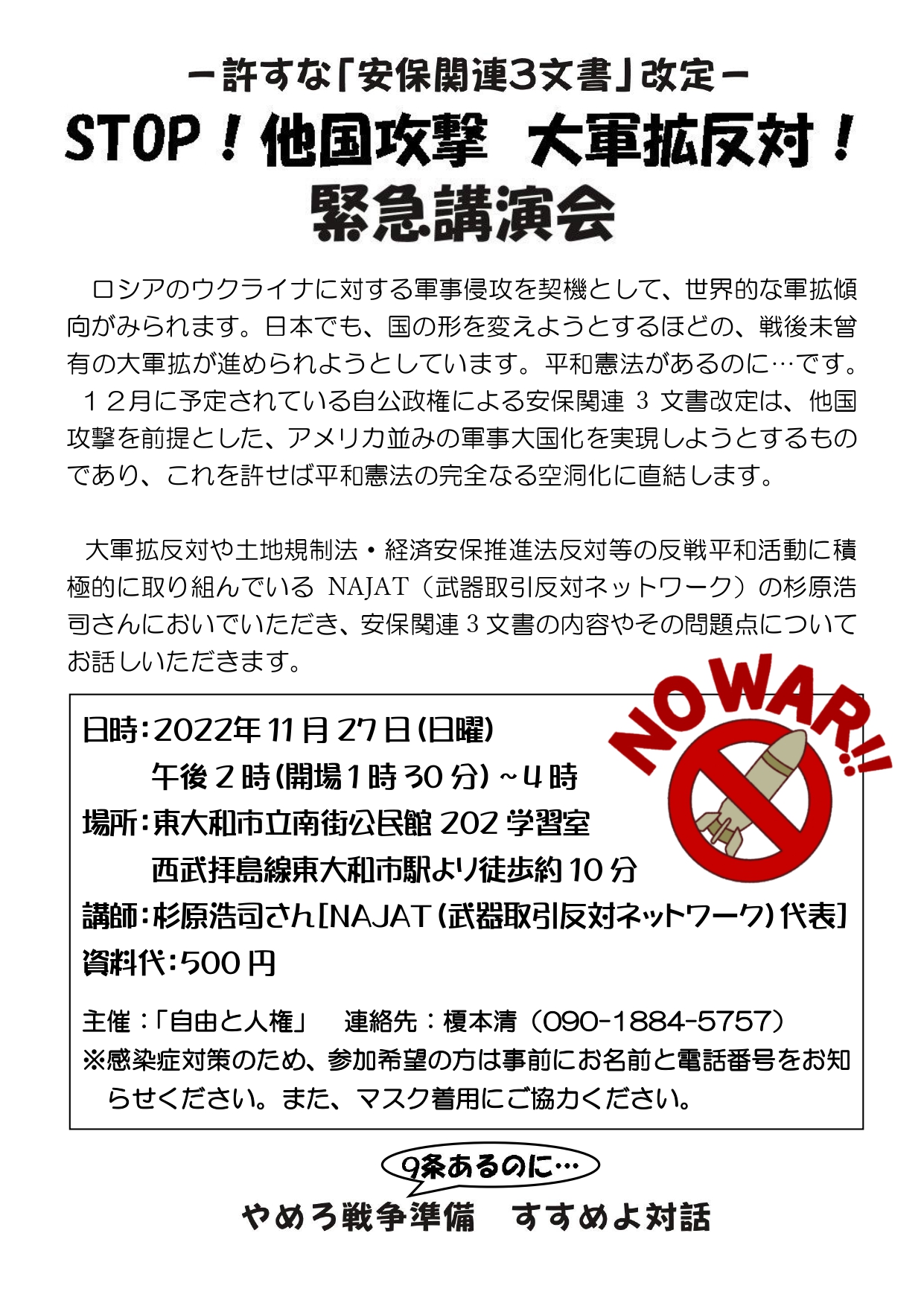 「STOP!他国攻撃 大軍拡反対!」11.27緊急講演集会の録画は以下をご覧ください。 ◆同催し物のアンケートは以下からご覧いただけます。 全部で8枚だったため、分類・分析はせず、そのまま掲示します。アンケートをお寄せいただいた方、有難うございました。 アンケートはこちら ◆同催し物の会計報告は以下からご覧いただけます。 会計報告はこちら ※この催しは終わりました。 −許すな「安保関連3文書」改定− ![]() STOP!他国攻撃 大軍拡反対! 緊急講演集会 日時:2022年11月27日(日曜) 午後2時(開場1時30分)〜4時 場所:東大和市立南街公民館202学習室 西武拝島線東大和市駅より徒歩約10分 講師:杉原浩司さん 【NAJAT(武器取引反対ネットホーク)代表】 資料代:500円 主催:「自由と人権」 連絡先:榎本清(090-1884-5757) ※こちらをクリックすると大きなチラシがみられます。 |