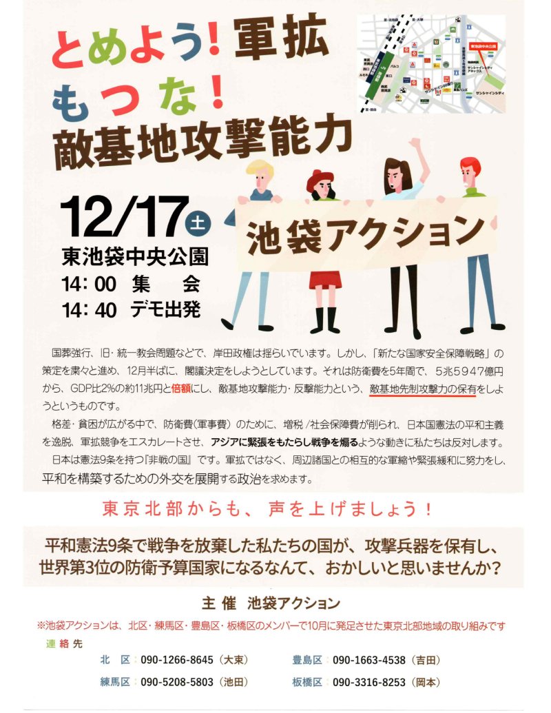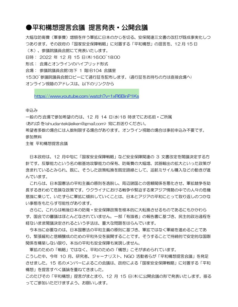 ★下記「平和構想提言会議」の録画がご覧いただけます。 ◆平和構想提言会議の提言「戦争ではなく平和の準備を」はこちらからダウンロードできます。 ◆安保関連3文書の問題点と対案については、以下の冊子(ネット掲載のみ、紙ベースのもの無し)が参考になります。 「9 条実質改憲としての安保三文書改訂」(改憲問題対策法律家 6 団体連絡会)はこちらからダウンロードできます。 ※これは11月27日の「STOP!他国攻撃 大軍拡反対!」11.27緊急講演会の資料としても用意したものです。 ★平和構想提言会議 提言発表・公開会議 ![]() 大幅な防衛費(軍事費)増額を伴う軍拡に日本のかじを切る、安保関連三文書の改訂が既成事実化しつつあります。 その政府の「国家安全保障戦略」に対置する「平和構想」の提言を、12月15日(木)、参議院議員会館にて発表いたします。 日時: 2022 年 12 月 15 日(木)16:00〜18:00 形式: 会場とオンラインのハイブリッド形式 会場: 参議院議員会館(地下 1 階)B104 会議室 15:30から参議院議員会館ロビーにて通行証を配布します。(通行証をお持ちの方は直接会場へ) オンライン視聴のアドレスは、以下のリンクから https://www.youtube.com/watch?v=1xR6BinP1Ks 【申込み】 一般の方:会場で参加希望の方は、12 月 14 日(水)18 時までにお名前・ご所属(あれば)を <shudantekijieiken@gmail.com> 宛にお送りください。 希望者多数の場合には人数制限する場合があります。オンライン視聴の場合は事前申込み不要です。 参加無料 主催 平和構想提言会議 ※チラシはこちらからご覧いただけます。 ![]() ★とめよう!軍拡 もつな!敵基地攻撃能力 池袋アクション」 12月17日(土)14:00から 東池袋中央公園 主催:池袋アクション ※チラシはこちらからご覧いただけます。 これまで関わりのあった、反戦・平和主張し、軍拡に反対する団体・グループについて紹介します。