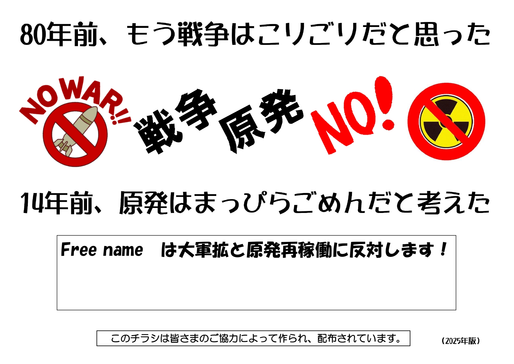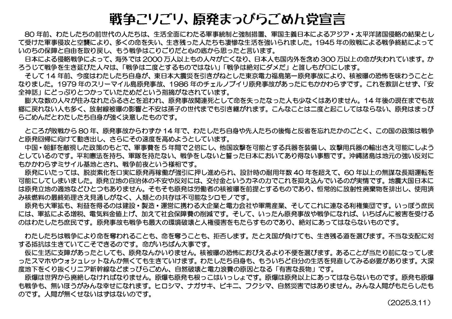 フリー版「戦争こりごり、原発まっぴらごめん党宣」作りました