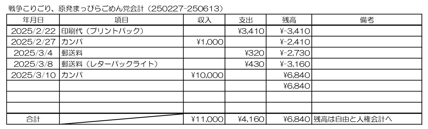 「戦争こりごり、原発まっぴらごめん党宣言25」会計報告